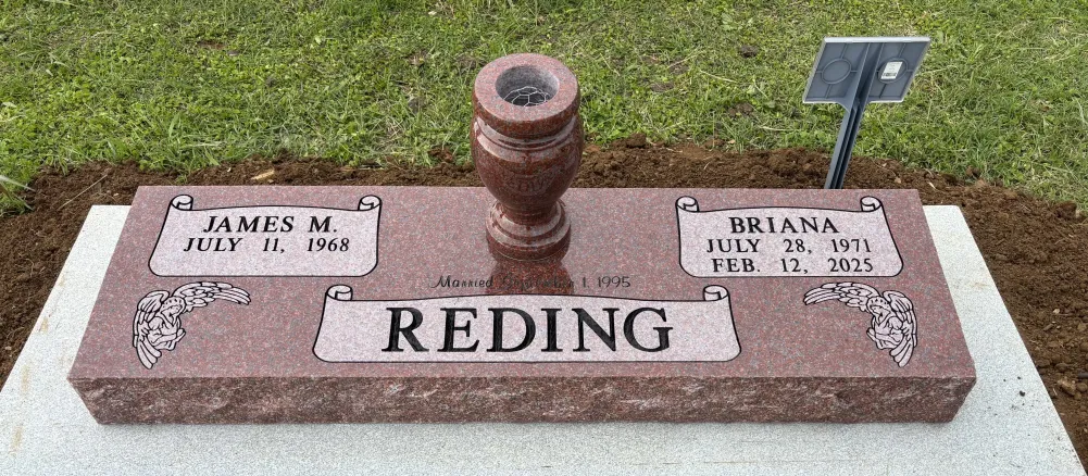 Our Double Marker is a flat granite marker designed for two people that can be installed level with the ground or above the ground sitting on a cement or granite pad. We have many designs and colors to choose from. Our price includes the engraving of the loved ones' names, birth dates, death dates, wedding date (if so desired) and one additional line of text provided it will fit on your choice of design.